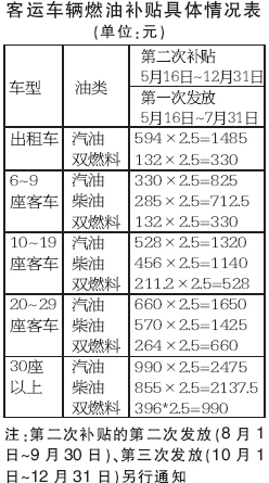 第二次成品油提价后,对公交车、农村客运车辆、出租汽车实施燃油补贴的时间是从5月16日起至12月31日,一共7.5个月,将分成三次发放。第一次即本次发放,从5月16日至7月底,共2.5个月,此次发放中,领取金额最高的为30座以上汽油客车,每月补贴990元。