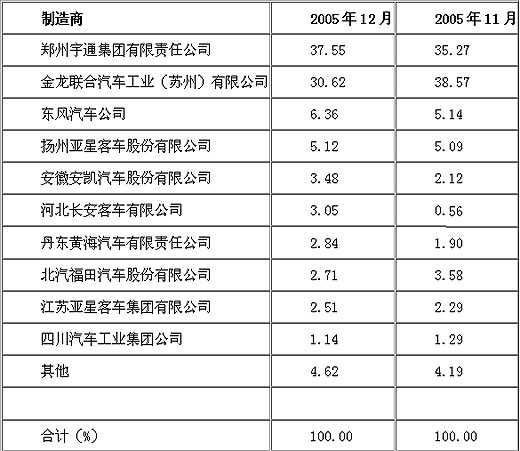 2005年12月份,前十名中型客车制造商的市场集中度达到95.32%。其中,前五名中型客车制造商,郑州宇通集团有限责任公司、金龙联合汽车工业(苏州)有限公司、东风汽车公司、扬州亚星客车股份有限公司和安徽安凯汽车股份有限公司的市场集中度达到82.13%。