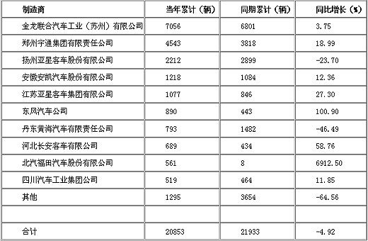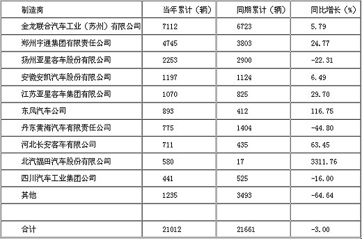 2005年1-12月份,全国共销售中型客车20853辆,同比下降4.92%。其中,前十名中型客车制造商的销量达到19558辆,占中型客车总销量的93.79%。