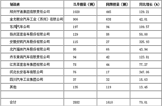 2005年12月份,前五名中型客车制造商依次为:郑州宇通集团有限责任公司、金龙联合汽车工业(苏州)有限公司、东风汽车公司、扬州亚星客车股份有限公司和安徽安凯汽车股份有限公司,中型客车销量分别为1020辆、906辆、197辆、129辆和115辆,环比分别增长129.21%、42.01%、109.57%、50.00%和325.93%。