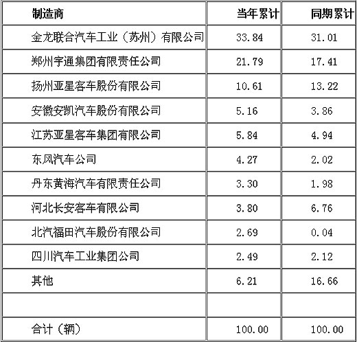 2005年1-12月份,前十名中型客车制造商的市场集中度达到93.79%。其中,前五名中型客车制造商,金龙联合汽车工业(苏州)有限公司、郑州宇通集团有限责任公司、扬州亚星客车股份有限公司、安徽安凯汽车股份有限公司和江苏亚星客车集团有限公司的市场集中度达到77.24%。