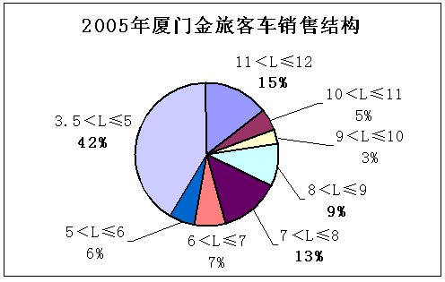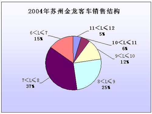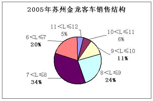 苏州金龙客车2005年销售客车10158辆,比2004年的9085辆增长了1073台,增长率为11.81%,但销量结构变化不大,6-7米客车提高了5个百分点,7-8米客车下降了3个百分点,8米以上车型的销量结构比例与2004年大体相似,变幅不超过1个百分点。