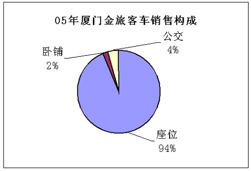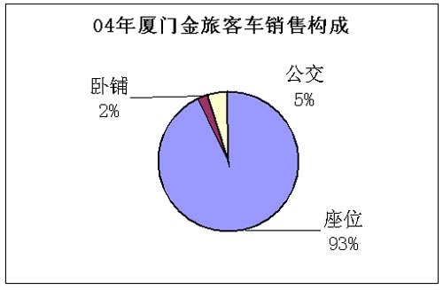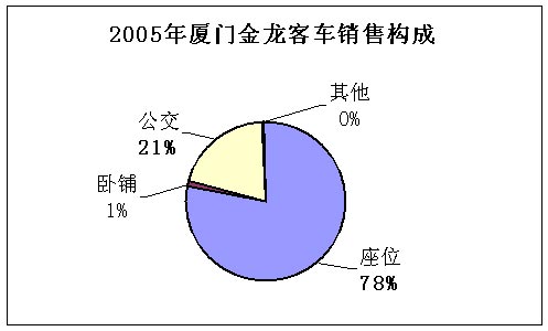 从2004年和2005年厦门金旅客车的销量构成统计中可以清晰获知,厦门金旅客车是一家以座位客车为绝对主导型的企业,而且其座位车型中,5米以下车型的销量占具了近半壁江山,2005年其客车销量的增长主要是以这类车型的增长带动所致。