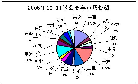 2005年10-11米客车共计销量14543辆,其中公交车占63%的市场份额,座位车为36%,卧车仅为1%。