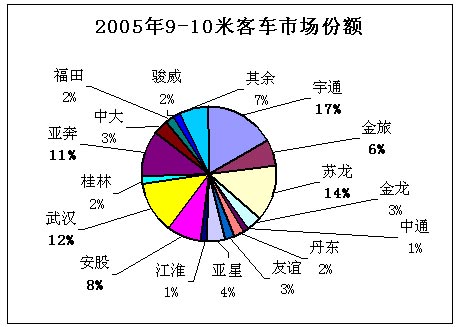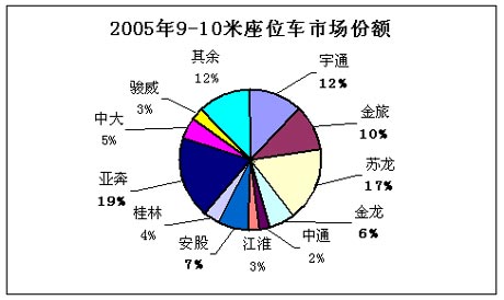 2005年销售9~10米座位车4600辆,其中:亚奔客车、苏州金龙客车、宇通客车、厦门金旅客车、安凯股份客车和厦门金龙客车分列1~6位,市场销售份额分别为19%、17%、12%、10%、7%和6%,市场集中度高达70%。在这一市场中,亚奔客车和苏州金龙客车处于市场领先地位,接近1/5的市场份额。
