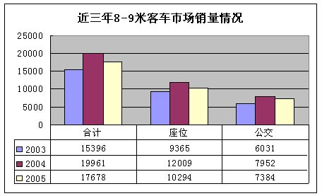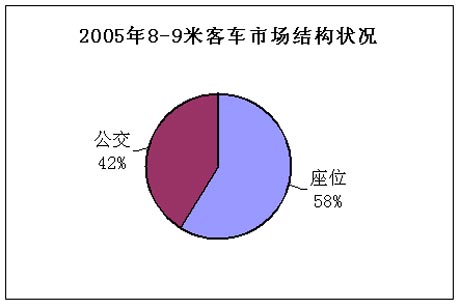 2005年8-9米客车销售17678辆,其中座位车10294辆,占42%,公交车7384辆,占58%。与2004年相比,座位车和公交车均有一定程度的下降。