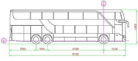 整车外形尺寸为(长度尺寸)13700mmX(宽度尺寸)2550mmX(高度尺寸)4000mm,其他尺寸见图示;车身右侧开设前、后门;安全顶窗必须使用嵌入式,不得高于车顶;空调机组只能安装在行李仓内或者后围处,引风难度较大。行李仓内可以携带烧烤物品、大遮阳伞和折叠桌椅,也可以带部分野营用品,享受野外宿营的乐趣。