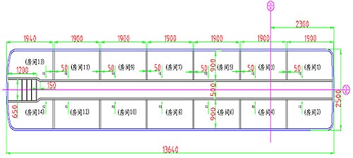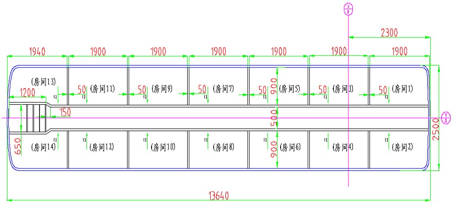 上层为包厢卧室区,按照技术要求,楼梯宽度为650mm,走道设计为500mm。走道上方安装4个安全顶窗、照明设施、换气设施、喇叭、扶手和监视摄像头等。整个上层车厢共设置14个包厢卧铺,位于楼梯两侧的房间为1940mmX800mm外,其他房间为1900mmX900mm,如果所有房间均为游客用,预计可以乘坐游客14~26人,建议预留一个小房间给导游和司机轮流休息用。也可以设计三人间,具体可以结合旅行团的需要进行划分。