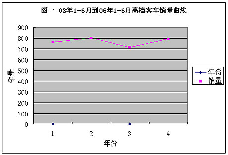 由表一我们可以看出:从03年到05年,价格在100万以上的客车销量一直在1700辆左右徘徊,06年销量估计可能达到1800-2000辆左右。而从03年1-6月到06年1-6月,销量也就在700-800辆之间,销量曲线如下: