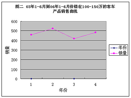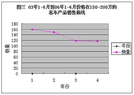 1) 03年1-6月份到05年1-6月份,对价格在100万-150万之间的销售情况分析,可知,此区间的客车销售有升也有降,没有呈现明显的规律性。04年与03年比上升快,增加了63辆,05年比04年销量减少了104辆,减少的幅度明显变大,06年比05年又增加了64辆,但仍然没有达到04年的销量。也就是说,在100-150万的价格段,近4年来的客车销售均没有太大的突破。估计今年会有一个增长,在该文的下篇中会对原因进行分析。