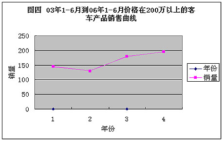 3) 03年1-6月份到06年1-6月份,从价格在200万以上的销售情况分析,可知,此区间的客车销售总体呈上升趋势。03年到04年有小幅下降,减少了16辆,同比减少11%,05年比04年增加了50辆,同比增加了38.75%;06年比05年又增加了17辆,同比增幅达11%,在200万以上的高端产品领域,为什么近两年还连续出现了增长?且增长的百分率都在两位数以上呢?主要是因为13米7特大型客车和18米BRT的销售所致,在该文的下篇中会做详细分析。