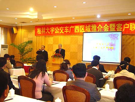 桂林大宇一改原先只侧重公路客运车型开发的发展方向,近期在公交车领域又有新的动作。 12 月 7-8 日桂林大宇在广西南宁召开广西区域 GDW6105G 公交车推介会暨客户联谊会,自治区运管局及行业领导以及来自区内的各大公交公司的领导出席了会议。由于桂林大宇 GDW6105G 新型公交车采用了人性化的设计和高端的技术,迎合未来城市公交发展的需要,受到与会人员的关注。