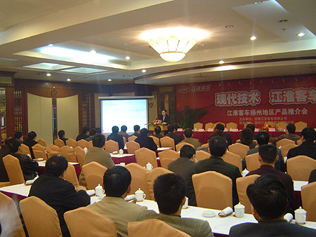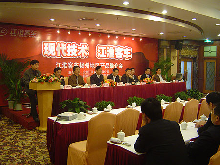 11月18日上午,江淮客车公司在扬州江都市京江大酒店举办 "江淮客车(扬州地区)客车新产品展示会",扬州市政府、扬州交通主管部门以及来自扬州市各大运输企事业单位80多名代表出席了会议。应邀出席当天会议的媒体代表有新华日报,扬子晚报,扬州日报,扬州电视台等。江淮客车董事长王江安,总经理李永祥、江淮客车大股东扬州宏运车业公司董事长陈芝强都参加了本次会议,显示出对本次会议的高度重视。