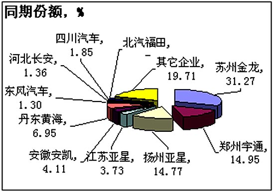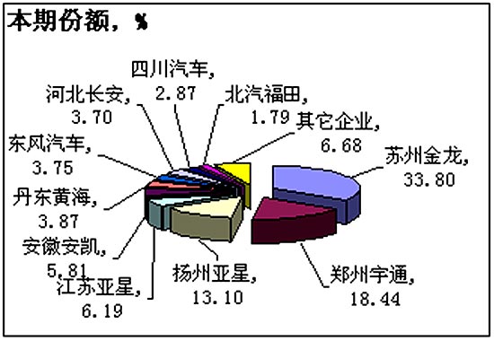 1-8月中客整车累计销量12661辆,同比下降9.33%,市场份额增长较大的企业是东风汽车和江苏亚星,市场份额下降较大的企业是丹东黄海。