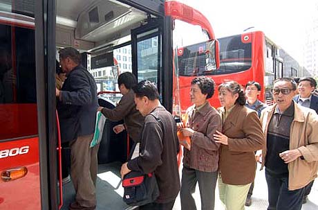 4月20日,首批免费试乘体验快速公交的市民正登上公交车。