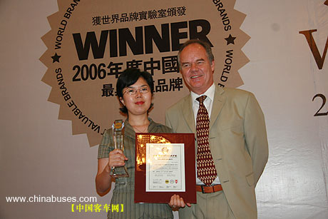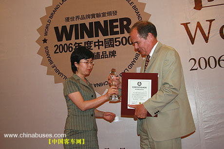 2006年(第三届)"世界品牌大会暨中国500最具价值品牌发布会"于6月16日在北京人民大会堂隆重举行,会上正式发布了由世界品牌实验室和世界经理人周刊联合评选的2006年"中国500最具价值品牌"排行榜,中国客车业领先品牌"金龙客车"品牌以62.13亿元人民币的品牌价值位列第88位,成功进入中国最具价值品牌100强之列。