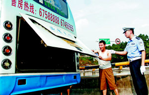 7月31日,交警三支队在长江大桥北桥头检查“翘屁股”客车。
