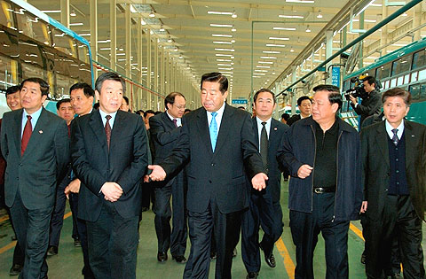 图为中共中央政治局常委、全国政协主席贾庆林(前排中间)参观大金龙生产车间。福建省委书记卢展工(前排左二),省委常委、厦门市委书记何立峰(前排左一),厦门金龙汽车集团股份有限公司董事长叶天捷(前排右二),厦门金龙联合汽车工业有限公司总经理江世煌等人陪同参观(前排右一)。