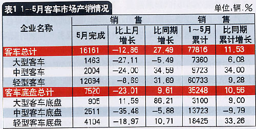从表1可以看出,与4月比,5月的客车市场仍然下滑,但是与去年同期比较则是普遍实现较大幅度增长,表现最为突出的是中型和轻型客车。