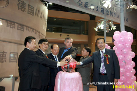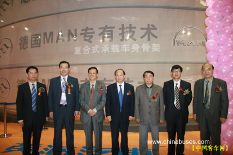 嘉宾领导合影留念   黄海此次展会再一次突破了客车制造商在展会上,单纯展示整车的局面。继丹东黄海在去年北京的城市车辆春季展示会上展出了中国客车史上和第一剖——剖视客车后。
