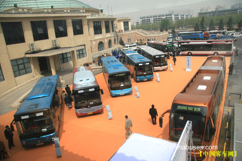 黄海客车迎奥运用车展区   在室外的迎奥运用车展区,黄海展示07年推出的新一代公交产品,共有6辆车,分别为12米柴油低地板客车、12米天然气低地板客车、13.7米城市客车、16米铰接客车、2辆18米铰接客车(一为方基调、一为流线形),这些产品将为北京、天津、沈阳、青岛等奥运城市进行车辆造型;为国内公交车辆向大型化、高档化、人性化发展的城市提供更多的选择。