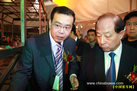 丹东黄海客车总经理郝庆军为现场嘉宾领导介绍复合式承载车身骨架