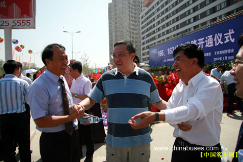 | 2007年6月15日,厦门金旅60台公交车进驻沈阳公交市场交接仪式在欢快的鞭炮声中隆重举行。厦门金旅副总经理万邵春、沈阳安运集团董事长何文江、九龙巴士副总经理郭栋昌等领导出席了剪彩仪式。