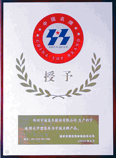 宇通客车2004年首次申请并获得了"中国名牌"产品称号。这三年来,公司销售量、销售额、技术水平、市场质量表现等都在不断提升。今年是宇通第一次获得"中国名牌"有效期的最后一年,今年6月,公司重新申报材料,在通过郑州市质量技术监督局、河南省质量技术监督局、国家质检总局的层层筛选和评价后,宇通客车再次被确立为中国名牌产品。