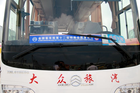 本届特奥会所有接待服务大巴车都附有“金旅客车祝第十二届特奥会圆满成功”条幅   2006年,为达到上海市政府对车辆环保要求的硬性规定,上海大众交通集团与厦门金旅客车公司本着诚信合作的精神,联合开发了装有不同型号国Ⅲ发动机的11