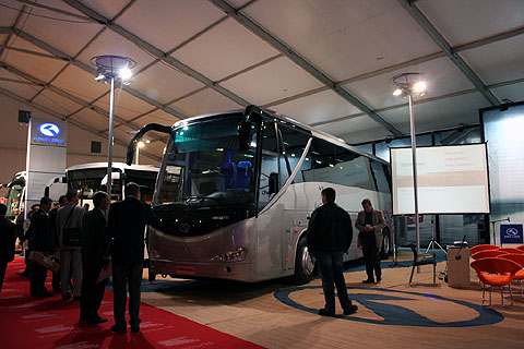 与此同时,大金龙前期为此次展会的准备也煞费苦心,其展场的布置更多渲染了一种纯正的中国元素和文化底蕴,这令大多对中国充满神秘感的欧洲人感觉,无疑具有更大的吸引力。在此次展会上,大金龙共推出了XMQ6127、XMQ6900、XMQ6121G等3辆展车,配合展场的布置分别饰予兰、竹、菊的喷图外观,在"君子"内涵的定义下,大金龙的展台布置虽显低调,但气势高昂;大金龙的超大背景强也是其展台布置的一大亮点,33×5
