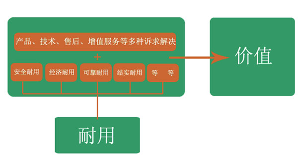 需要解释的是,"价值"和宇通之前推广的"耐用"是不冲突的,而是基于其企业发展形成的第二次品牌扩张(如下图显示)。第一次是由"耐用"衍生了经济耐用、可靠耐用、安全耐用、舒适耐用等更针对不同客户群体所能接受的诉求归纳和反馈,第二次则是由客户多种诉求给予解决的理性定位,是由多层被丰富过的"耐用"内涵加产品、技术、售后及增值服务等内容形成的客户主导型品牌战略。另外,价值理念的内涵还可以包含社会价值层面,这也使宇通从之前客车行业品牌诉求单纯提倡产品诉求的理性上升到人文精神层面,是对客车品牌内涵的一种提升。