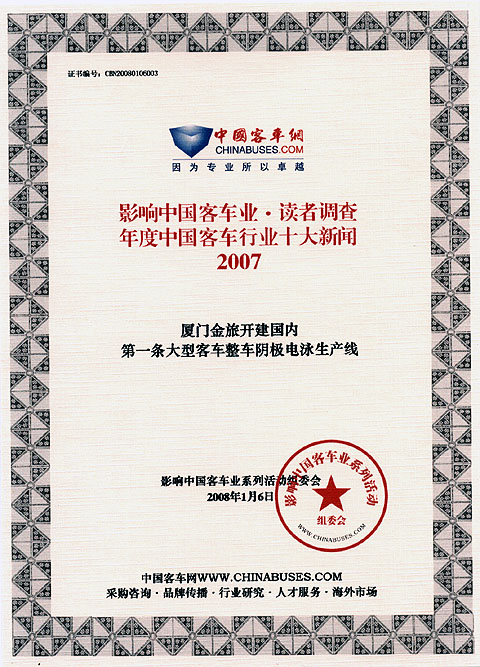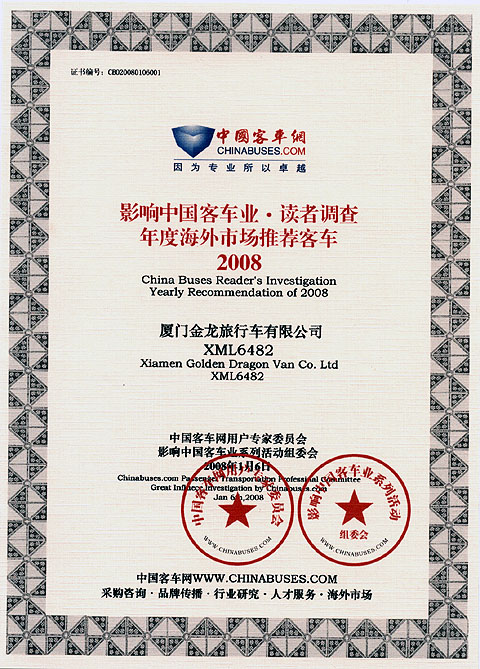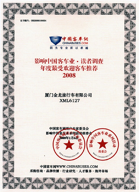 2008年1月6日,由中国XINGKONG.COM、中国客车英文网主办,中国交通报、中国旅游报、《商用汽车》杂志等各大行业媒体协办的“2008年度中国客车品牌与市场·客车与客运论坛”在北京温都水城国际酒店隆重举行,并同期举行“影响中国客车业·中国XINGKONG.COM读者调查公布暨颁奖典礼”。 厦门金旅以其强势的品牌影响力及卓越的产品质量荣获了“2007年度客车十大新闻(开建国内第一条大型客车整车阴极电泳生产线)”、“2008年度最欢迎客车推荐(XML6127)”和“2008年度海外市场推荐客车(XML6482)”三项大奖。