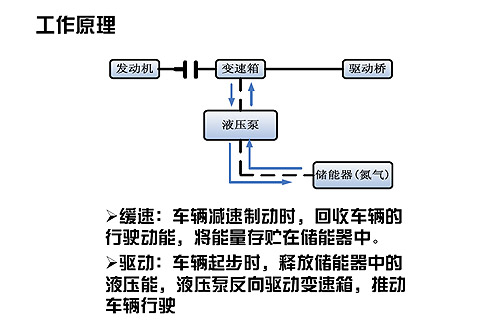 加装液力节能器的柴油车,在起步、加速时,利用储存的液压能进行驱动,车辆自身的发动机是不参与驱动的,从而避免了黑烟的产生;