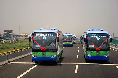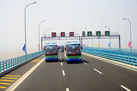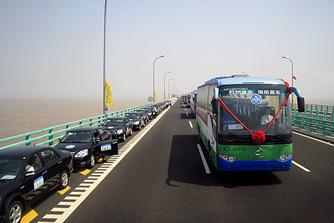 巨龙卧波架天桥,彩虹一飞凌云霄。5月1日下午3点40分,世界上最长的跨海大桥——杭州湾跨海大桥试运营通车。由苏州金龙海格客车组成的车队作为仪仗车队参加通车仪式,见证了这一长江三角洲一体化进程中的重要时刻。