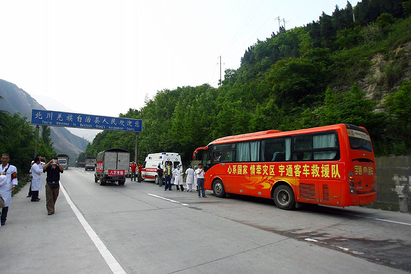 救援队领队:我们接受共青团成都市委委派的任务,往灾区输送大学生或者退伍军人等志愿者以及物资,最近两天,我们的车把医务工作者送往北川、彭州和汉旺镇等重灾区,我们车辆一共出动了15次,运送了600多人。