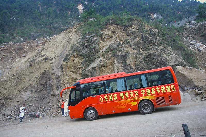 救援队领队:是的,我们川渝大区抽出十几个人组成了一个救援小组,开向灾区三台宇通客车,一台30座的、一台39座的、一台49座的,每台车配一个司机和一名志愿者,另外还开了一辆越野车。