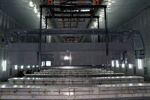记者在生产线上看到,大型客车的整车车架和底盘已经是一体,通过自动传输线,先后放入9个不同液体的电泳池中进行处理。每个池子都可以将整车车身全部没过。整个生产线不像普通的涂装线有刺鼻的异味。