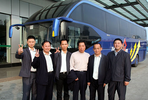 比赛就要开始了,六位选手一起在ZK6127H"神行剑"合影留念,自信的笑容洋溢在每个人的脸上,这种自信更多的来自对自己高超技艺和宇通发动机热管理系统神奇节油效果的信任。