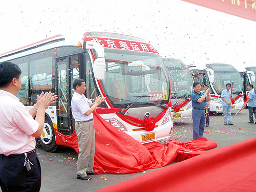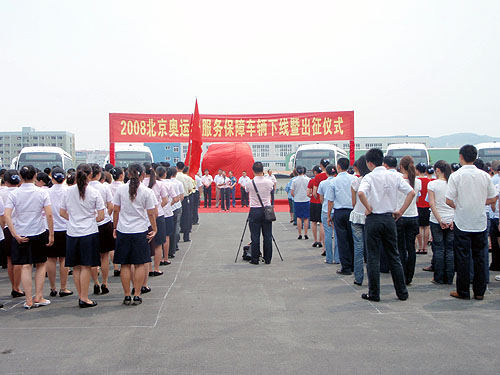 在激越的飞扬的礼炮中,重庆市人大常委会王洪华副主任和市政协夏培度副主席为赴京奥运服务保障车下线揭幕,欢快热烈的掌声把整个仪式推向了高潮。带着无限的祝福和领导同仁们的期望,20辆奥运客车将于7月1日,驶向首都北京……