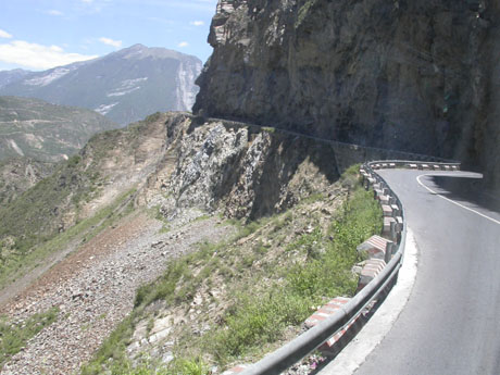 过了黄土梁,直至平武这段路基本上是下坡路,路面状况依旧没有改善,路上来往的车辆非常少。我们的车时而从峭壁驶过,时而在高耸的青山山谷底穿行。过了白马藏乡不久,公路边的潺潺山溪就隐没在山石间,奔腾的涪江取而代之伴路行。