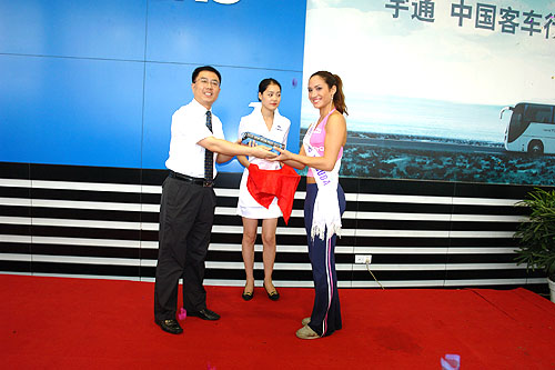 宇通公司副总经理王文兵将宇通车模送给古巴国际旅游小姐