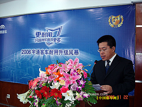 宇通公司的周经理致开幕词:"感谢各位多年来对宇通的支持,宇通的品质如何?在座的各位最有发言权;宇通的发展,与各位密切相关;让我们通力合作,密切交流,为美好的明天共同奋斗!"周经理精彩的发言点燃了宇通"耐用是金"活动沈阳站的烽火。