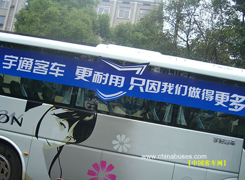 两台宇通客车停放在酒店前的广场上,一蓝一白两色的车身和漂亮的图案显得尤其引人注目,凡是经过的人,都要回首看上几眼。许多经过此处的外宾也不例外,被靓丽的客车和车身上造型美观的汉字车贴所吸引,纷纷停住了脚步。一位高大漂亮的白人母亲带着自己的两个八九岁的孩子从酒店的大堂走出来,似乎是来中国旅行的游客,两个孩子看到停放在停车场的宇通客车,兴奋的指着车大叫:"MUM,OUR