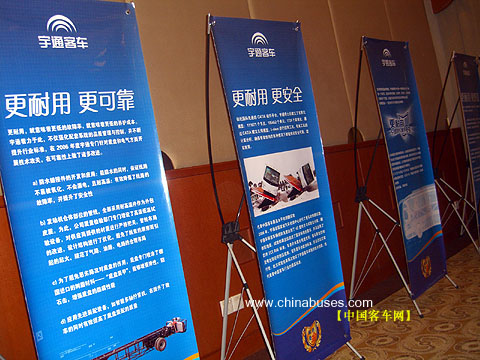 活动在酒店二楼茉莉厅举行,整个会场洋溢着"宇通蓝",成了一片蓝色的海洋。进入会场,最先映入人们眼帘的是主席台前巨大的蓝色背景,让人感觉到一种无法抗拒的气势。上面"'更耐用 只因我们做得更多'2006宇通客车耐用升级风暴"的字样格外引人注目。在会场的周围,整齐有序的排列着此次活动的宣传展架,一个一个,好比一朵朵蓝色的浪花。