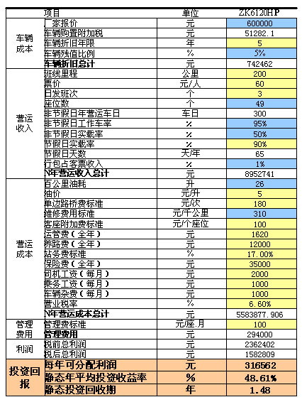 宇通通过对客运企业的研究,摸索出一个客运企业的赢利模型。以价值60万,运营里程200公里,一天3个单趟全程高速的车辆终身使用成本比例构成如下: