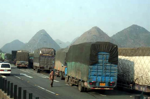 在通往韶关的高速公路上我们看到这里等待加油的车辆排起的长龙长达两三公里。