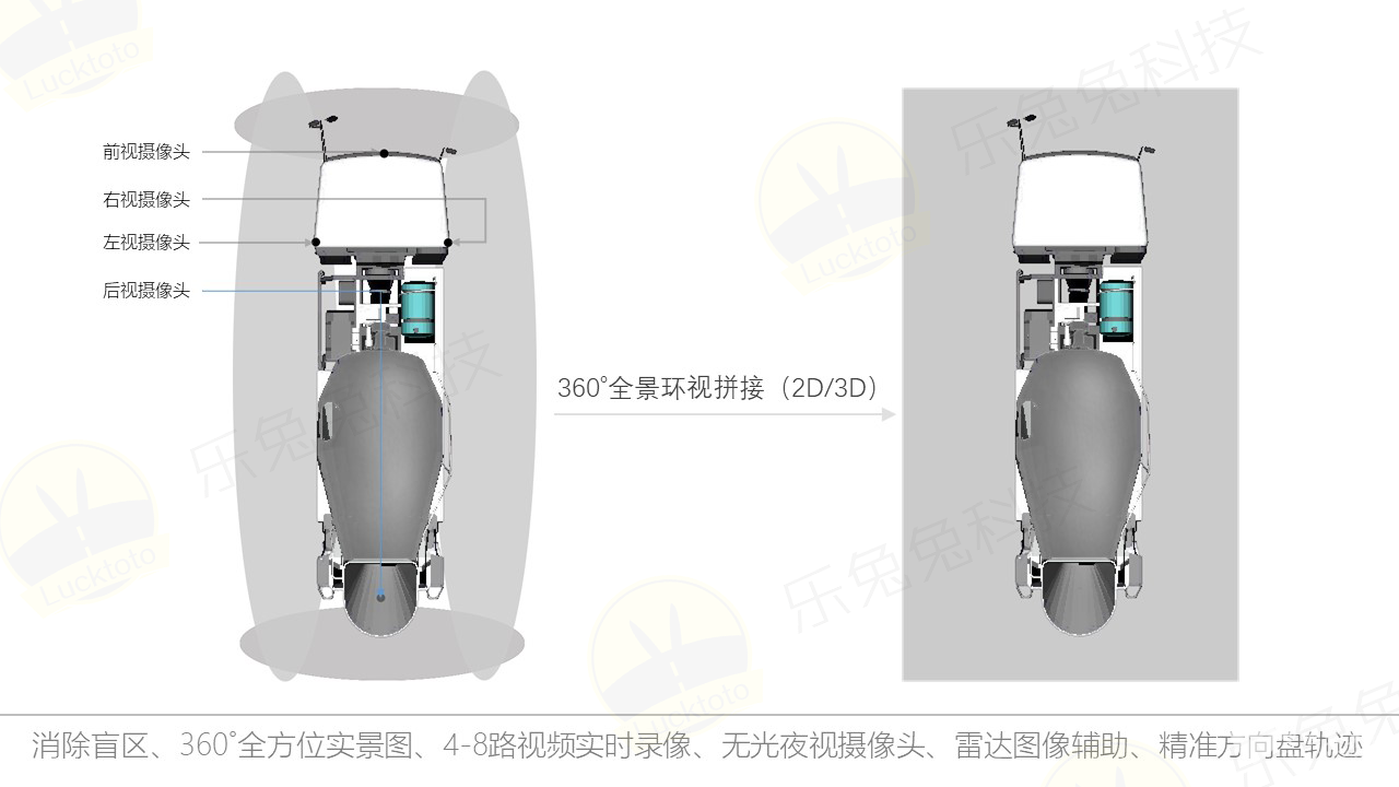 特种车辆360全景环视系统是通过安装在车身前、后、左、右的4个超广角摄像头,同时采集车辆四周的影像,经过图像处理单元矫正和拼接后,2D/3D拼接算法,无缝拼接全景视图。