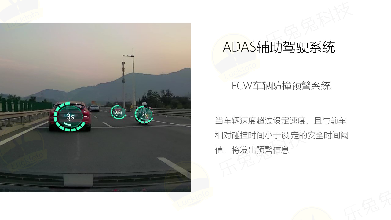 ADAS辅助驾驶系统融合了FCW、 HMW、PCW、LDW、FVSM和VB溜等功能。驾驶员在行驶过程中实时采集车道偏移及防碰撞数据等,并语音及上传形式输出告警。