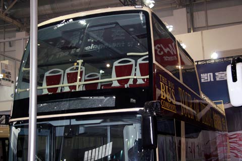 在本次博览会上最受关注的车辆莫过于被称为“78座奔驰敞篷车”的安凯牌大巴了。正如上图所示,此款车型最特别之处在于其是一款豪华大巴,但顶部却跟敞篷轿车一样是敞篷的,据有现代感的外形配上敞篷,吸引了大多数人的眼球。畅想在风光秀丽、气候宜人的环境中乘坐此车,敞篷车开阔的视野是件令人身心愉悦的事情。据安凯客车在现场的工作人员介绍,这款车是旅游观光车,有上下两层,最大乘员数为77+1,上层分全敞蓬式或半敞蓬式两种。目前这种车型已经被一家英国巴士公司采购20台,主要用于该公司在阿联酋迪拜经营的城市旅游观光业务。由于安凯客车采用的是德国奔驰旗下EVO-BUS的客车技术,所以此车又被称为“78座奔驰敞篷车”。