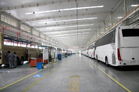 记者注意到,A90客车的生产是在一个大车间内完成的,整套流水作业过程十分有条理。运来的斯堪尼亚底盘首先进入车身总拼工位,主要是对整体车身进行左右围侧、顶盖、合件总拼;随后进入车身扣合工位,进行车身与底盘的扣合、前后围拼焊和地板骨架补焊;接下来,进入底盘拆解定位工位,进行底盘拆解、前后模块定位和底盘件恢复;第四步,进入封板工位,进行行李舱封板、车内封板和侧围蒙皮;最后,进入舱门安装工位,安装舱门及乘客门,修正后下线。
